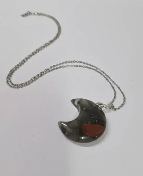 Ripats on lihvitud naturaalsest verekivist Madagaskaril ja varustatud hõbedase metallklambriga. Lisasime ripatsile vastupidava 304 roostevabast terasest keti. Kett on stiilse "haamriga töödeldud" faktuuriga, mis püüab kaunilt valgust. Toode saabub viisakas karbis.